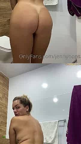 Filling a jar with her golden liquid and pipi accident in the bathroom