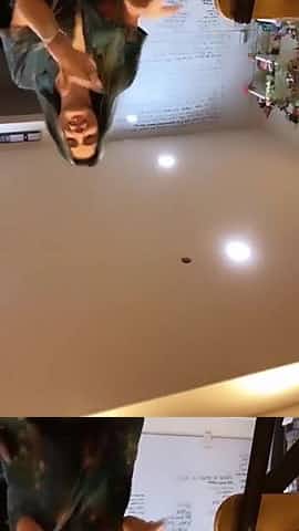 Bella Thorne dancing at home in open shirt.