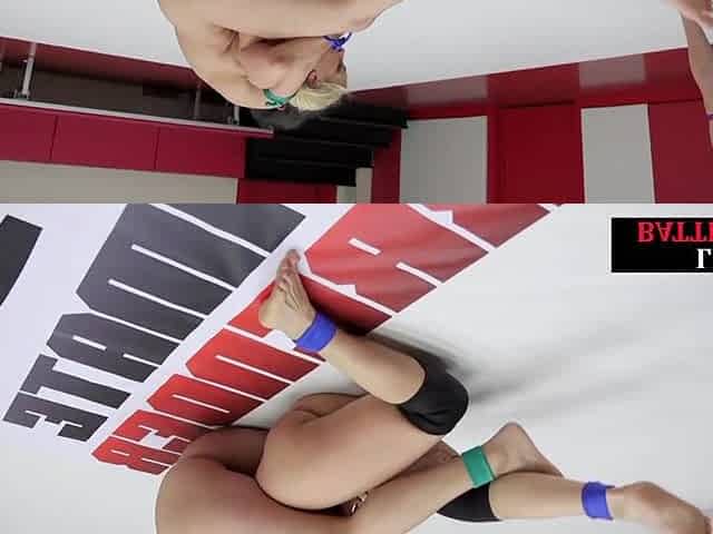 Glasses lez wrestler pussytoyed in 3some