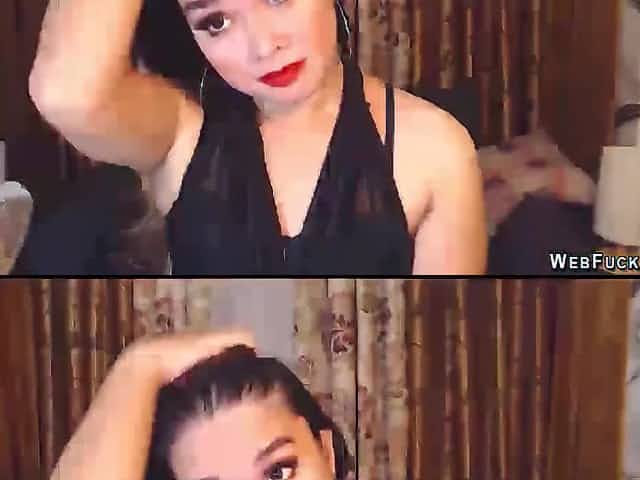 Asian amateur brunette babe in black see through top sitting on her PC