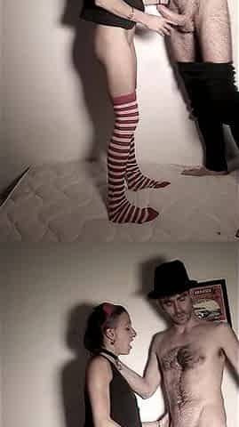 Busty amateur babe in heels tugging her photo models cock