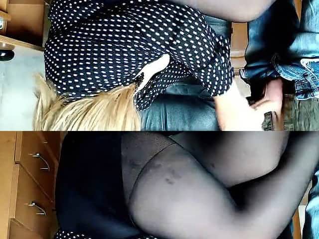Wild female is dressed in dark-hued pantyhose and garter belt while blowing salami, in the late afternoon