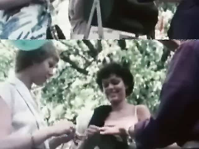 Busty MILFs Sharing a Dildo Outdoors