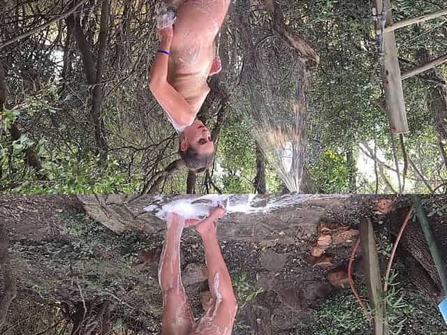Chubby Slut Soaping up Her Body Underneath a Outdoor Shower