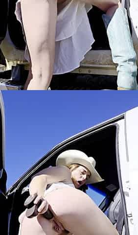 Outdoor solo masturbation scene with curly blonde