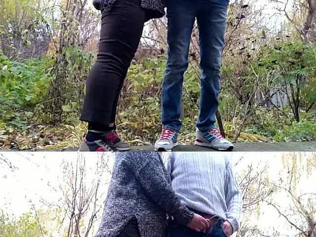 Kinky brunette blows a guy outdoors before he pees on her