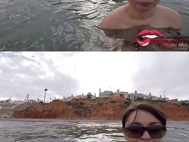 Naked and with sex toy in her pussy she makes a straw on the beach
