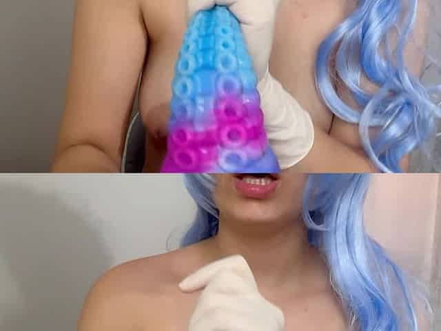 Indian Wife Masturbates in Medical Gloves and Gives a Handjob to a Monster Dildo