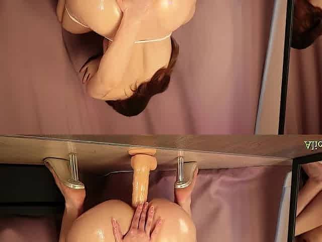 "Riding a big dildo front and back"