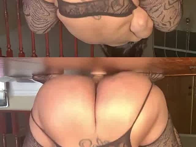 Hot lesbians with big tits wearing latex sit on big black dildo on kitchen floor