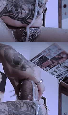 Brunette stripper with big natural tits and pierced nipples jerks off dildo toy