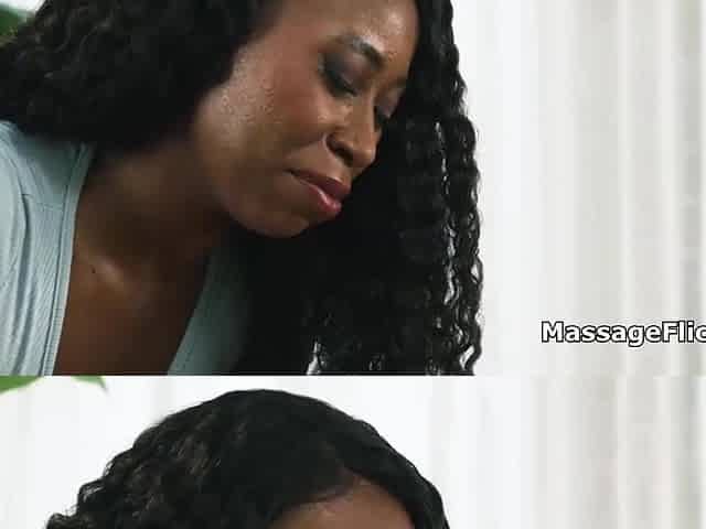 Ebony masseuse scissoring with fluffy Asian client