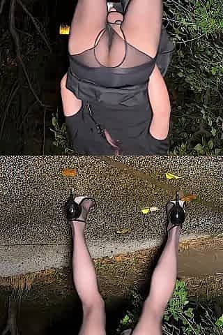 Sissy outdoors pissing and jizz flow two