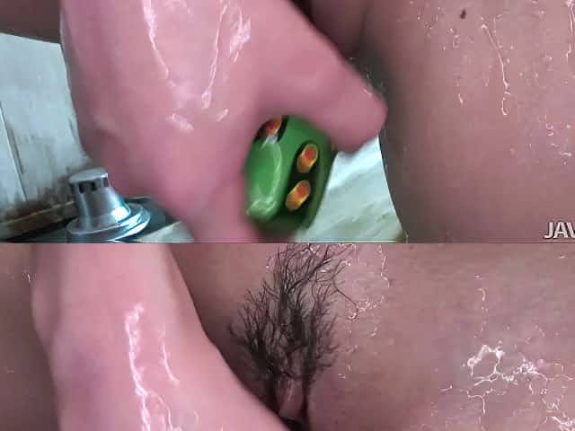 Hairy Asian teenager pokes her furry burger with dildo in sauna