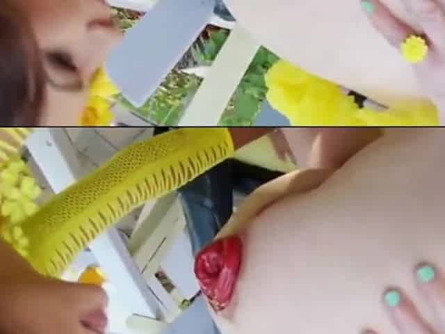 Exhibitionist riding a red dildo