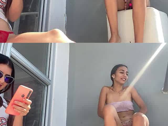 Playing outside on my balcony, flashing my tits and thongs as i masturbate and rub my ass and pussy