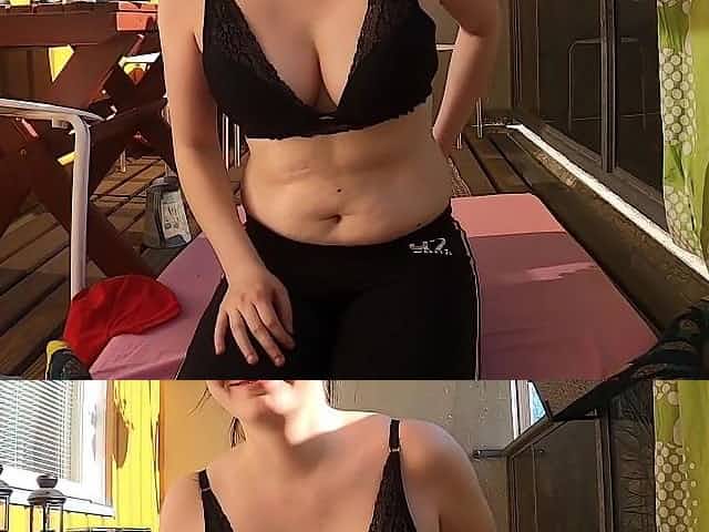 Meloned Patricia is masturbating on the balcony