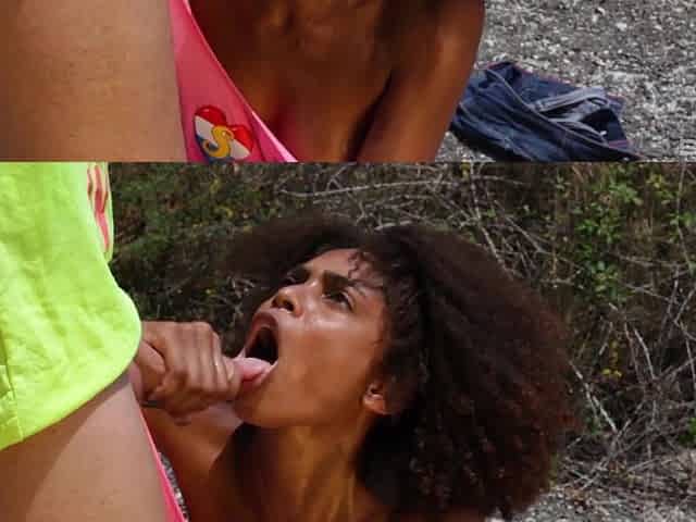 Skinny teen with small tits Bambi Black rides cock outdoors