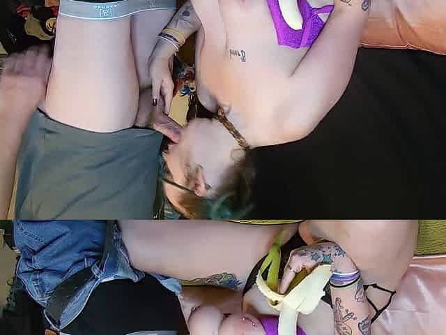 Babe gives blow job and he cums on banana, babe eats cum covered banana