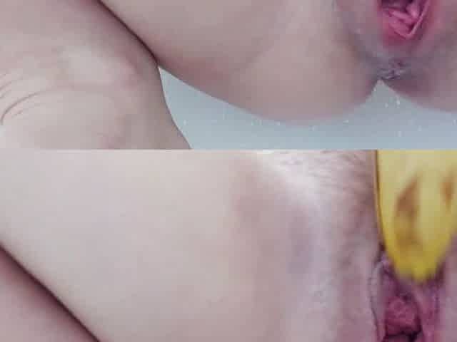 Anal food play with bananas in the shower