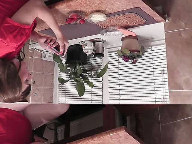 Kitchen sexy mommy Milf without panties eats banana, fruit, masturbates pussy