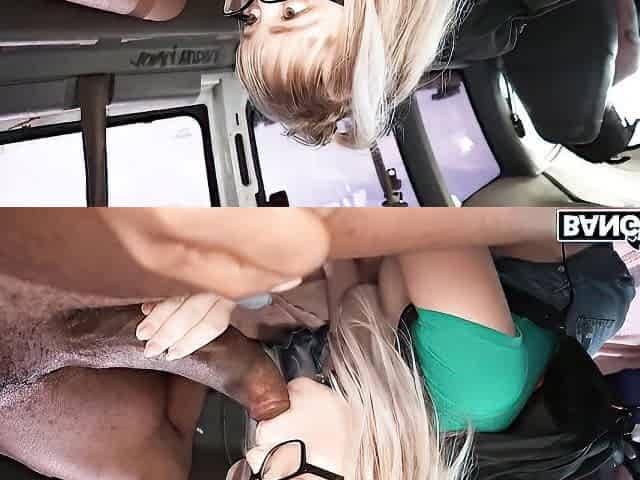 A blonde is riding a cock like a cowgirl in the back of the Bang Bus