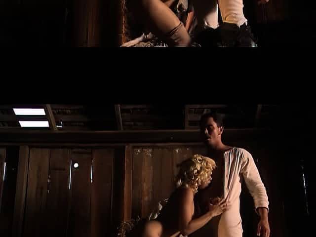 The local saloon slut meets the cowboys in the barn and rides their dicks