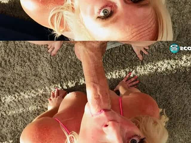 Curvy blonde bimbo in a bikini top gets stuffed down to the balls