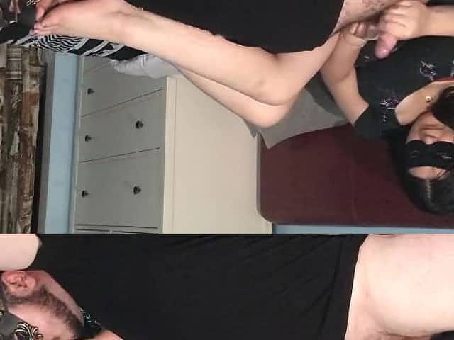 Fat brunette hair is wearing a mask during the time that her partner is worshiping her feet in the bedroom