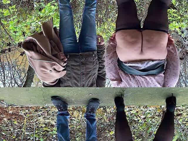 Playful mother-in-law bent over in front of son-in-law to pee