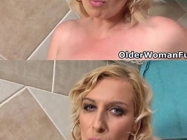 Curvy older Kaylea puts sextoy to work in washroom