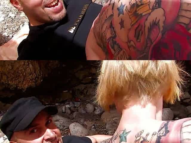 Tattooed golden-haired drilled on the beach