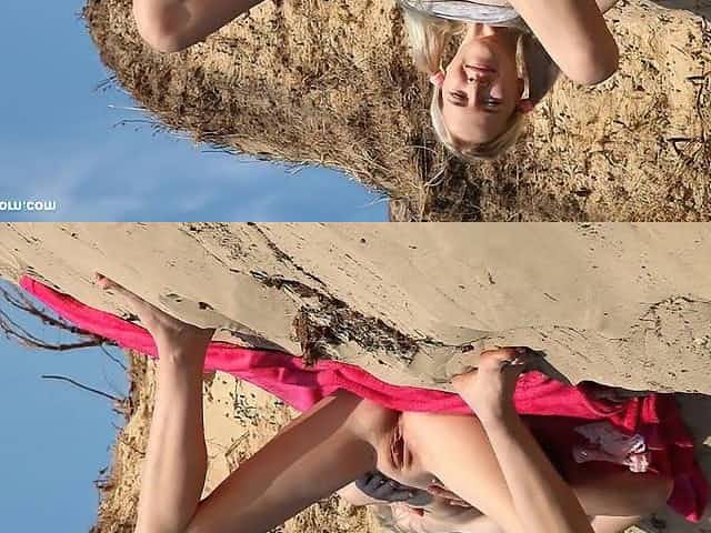 Russian girl is masturbating smooth pussy on the sunny beach