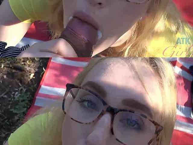 Beautiful blonde gives a great blowjob in the woods.