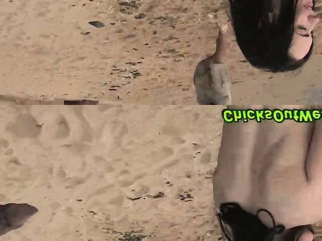 Brunette big titted sex bomb oil tugging pecker at the beach