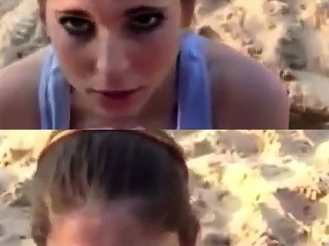 Pretty horny beach girl kneels down and gives a sensual blowjob
