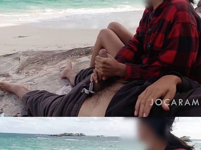 girl jerks hubby's cock at beach