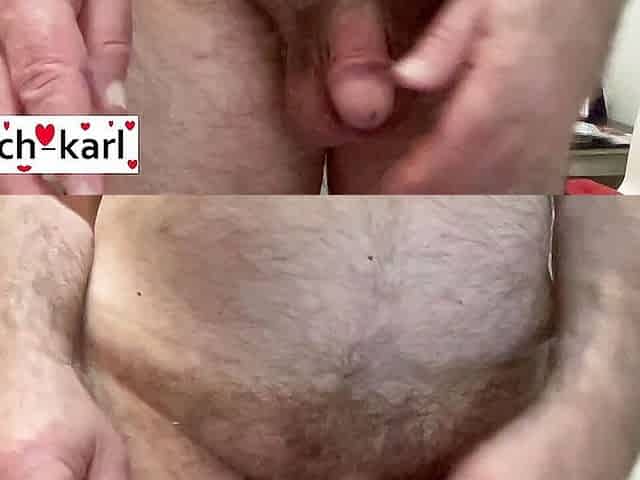 Hot German hairy Daddy bear jerking off his fat cut cock and cums