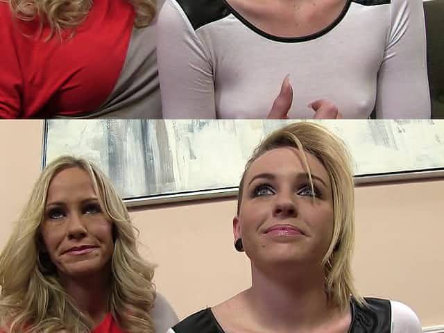 Blonde duo of MILF and teen get interviewed in a behind the scenes clip