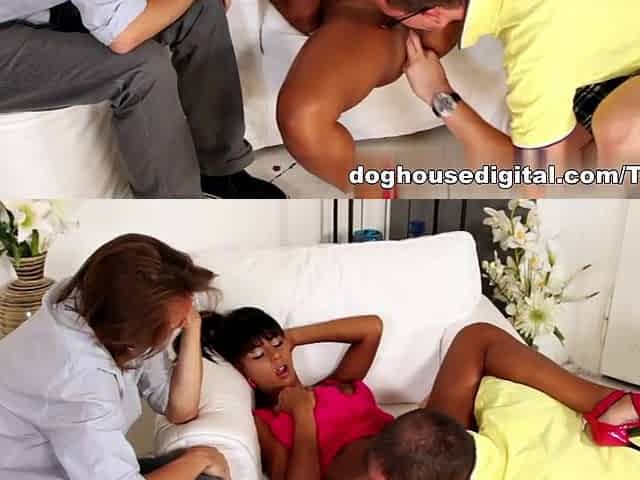 Muscular man pounds his girlfriend's petite Colombian stepsister and they get caught in the act