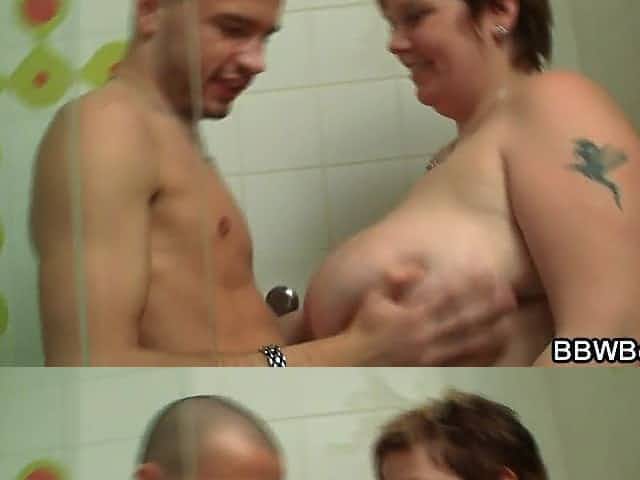 Skinny guy fucks busty plumper in the shower