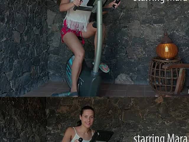 Curvy brunette with long hair takes a bicycle cycling posture for a hard penetration