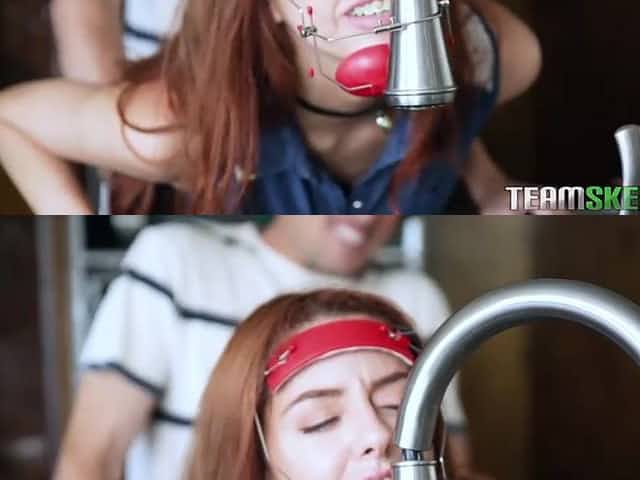 Bent over the sink redhead with big butt is poked doggy quite hard