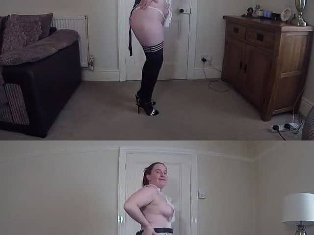 Overweight wife dancing and bouncing in maid pinafore nylons