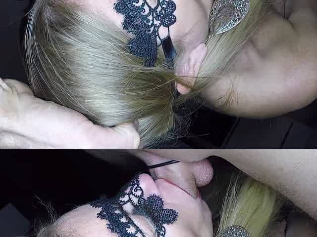 Dutch masked blonde milf suckes cock and gets hot load on her tongue