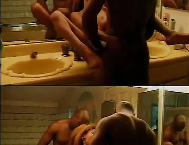 "Hard cock hunk and blonde ebony fuck in the bathroom"