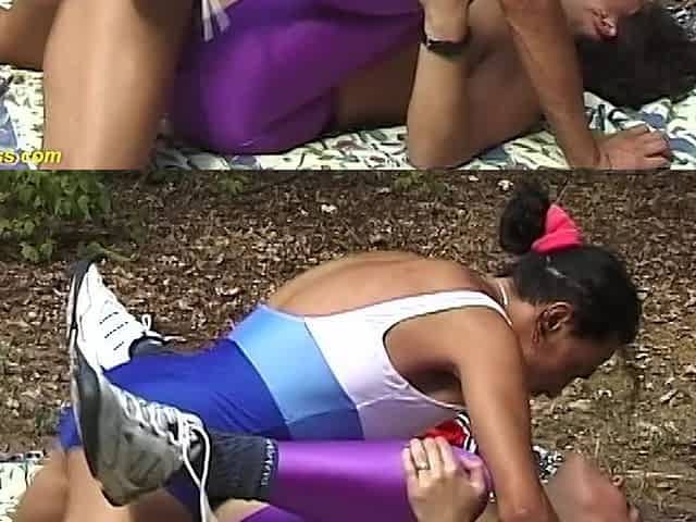 Pretty black babe takes cock inside her hairy cunt out in the bush