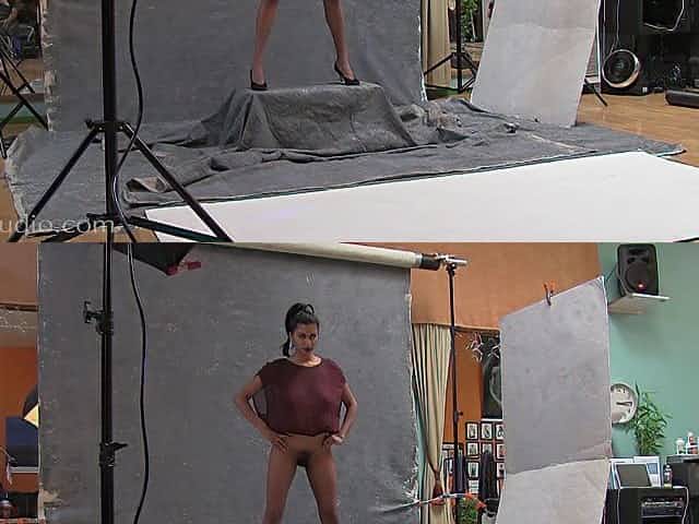 Busty model in the studio shows off her bush and boobs