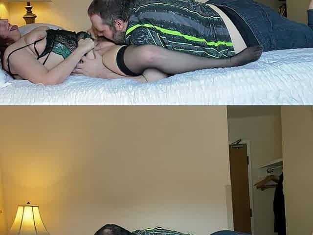 Mature red haired slut with huge tits and fat body sucks sweet cock of her guy