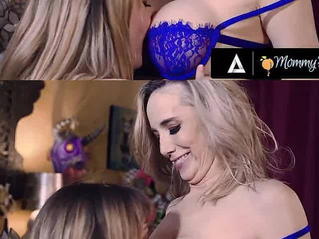 Horny mature lady relishes the sweet taste of the slender blonde's juicy peach